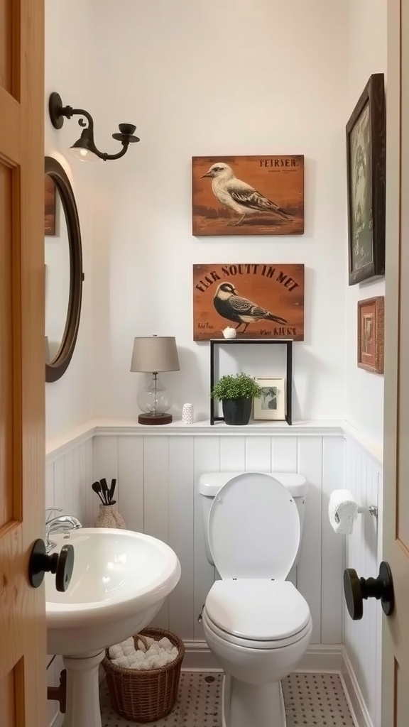 Vintage wall art can really bring a small bathroom to life. In this cozy space, the artwork features charming bird illustrations that add a touch of nature. The warm tones of the art complement the light walls, creating a welcoming feel.