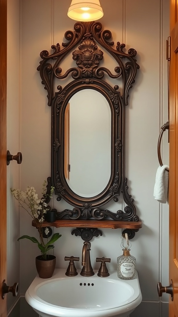 Antique mirrors can add a unique charm to any small bathroom. The image shows a beautifully crafted mirror with intricate details and a vintage feel. This kind of mirror not only serves a practical purpose but also acts as a statement piece.