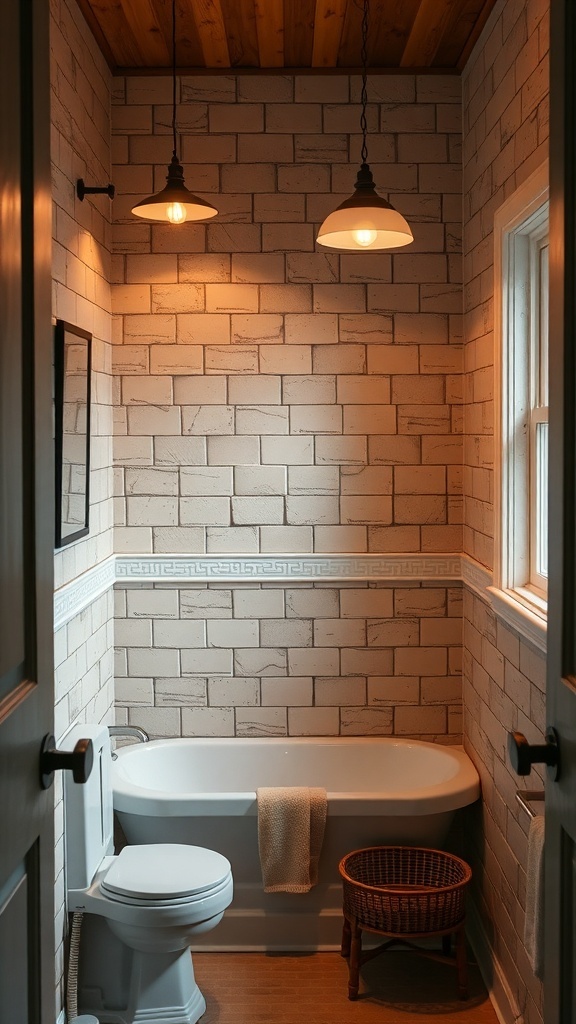 The soft glow from the lights enhances the natural textures of the brick walls, creating a cozy atmosphere. The combination of the light fixtures and the earthy tones of the bathroom makes it feel inviting and relaxing. Choosing the right lighting can transform your small bathroom into a serene retreat.