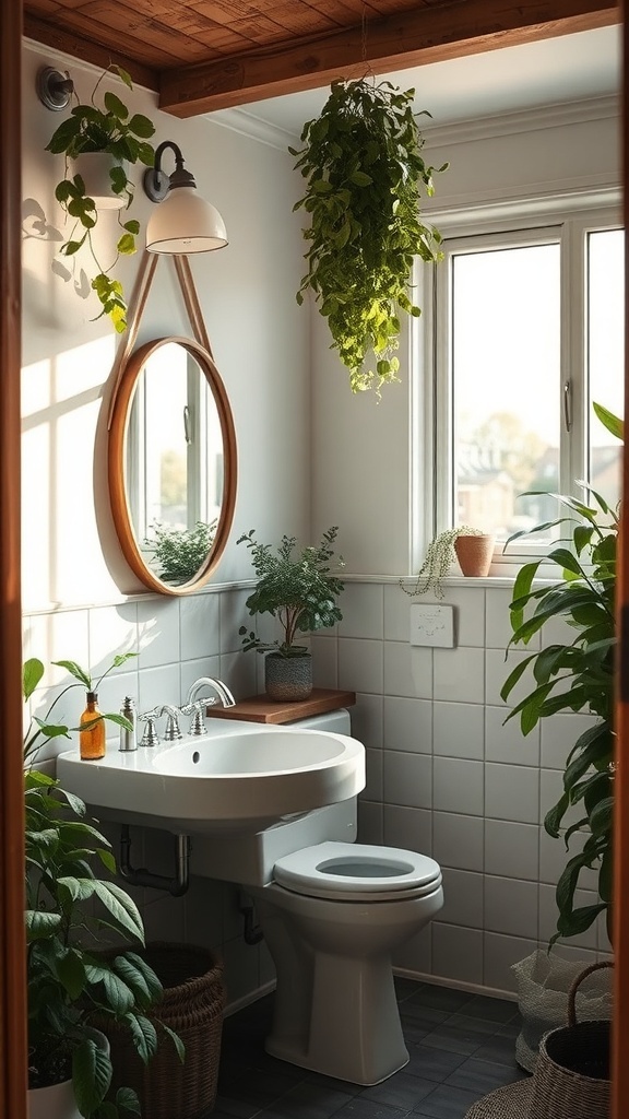 Plants are a fantastic addition to any bathroom. They not only add a touch of nature but also help purify the air. In this image, hanging and potted plants bring life to the space. The greenery contrasts nicely with the white tiles and wooden accents, making the bathroom feel warm and welcoming.