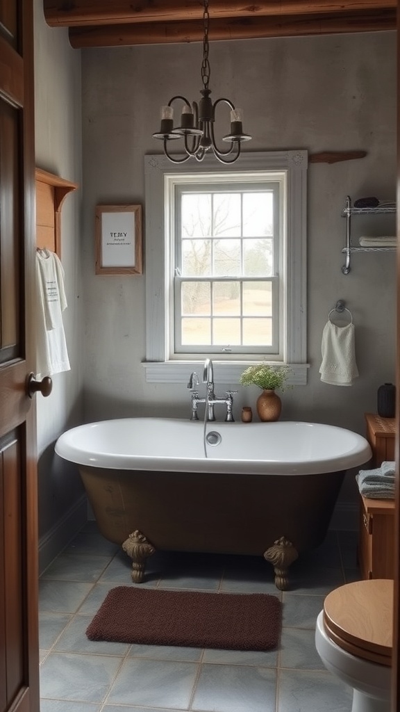 A freestanding bathtub can be the centerpiece of a rustic small bathroom. This image showcases a charming tub that combines elegance with a cozy feel. The tub’s unique design and warm tones bring a touch of vintage style to the space.