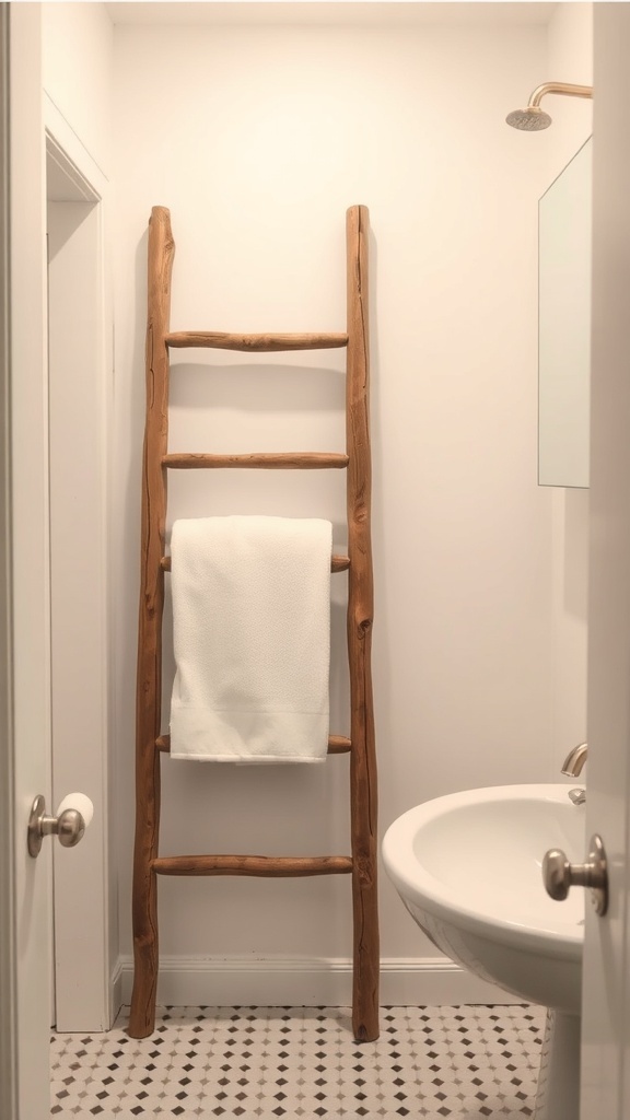A wooden ladder towel rack is a charming addition to any small bathroom. This simple yet stylish piece not only serves a practical purpose but also adds a rustic touch to the space. The natural wood finish brings warmth and character, making the bathroom feel inviting.