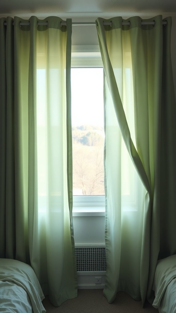 In the image, you can see sheer sage green curtains that allow light to filter through while still providing some privacy. This is perfect for students who want to enjoy natural light without feeling exposed. The curtains frame the window beautifully, creating a serene atmosphere.
