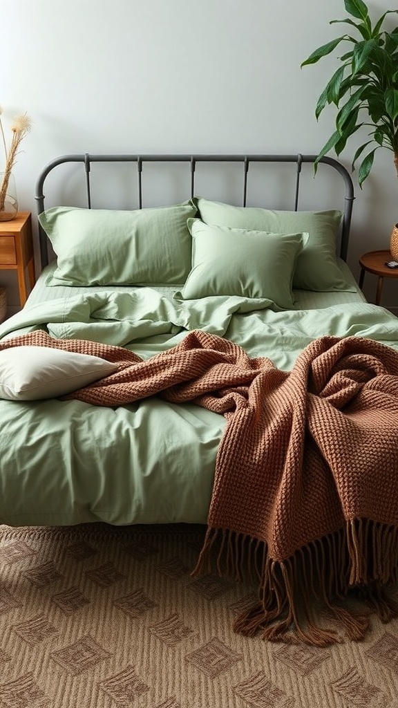 The image showcases a beautifully arranged bed with sage green sheets and pillows. The addition of a warm, textured brown throw blanket adds depth and contrast. This combination not only looks stylish but also creates a comfortable atmosphere for studying or relaxing.