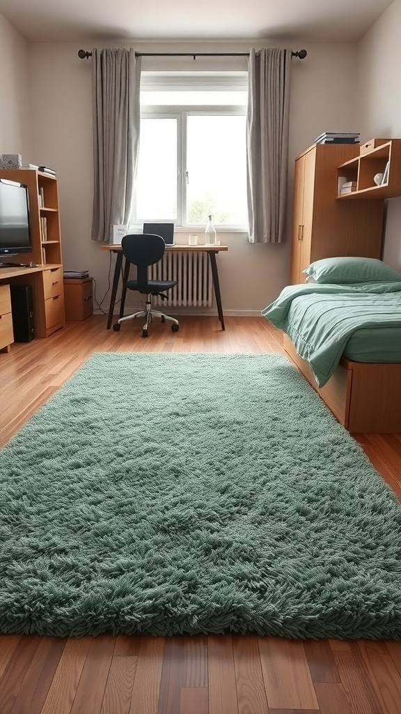 Sage green rugs can really bring a cozy vibe to your dorm room. The soft texture of the rug in the image adds warmth and comfort, making it a perfect spot to relax or hang out with friends.