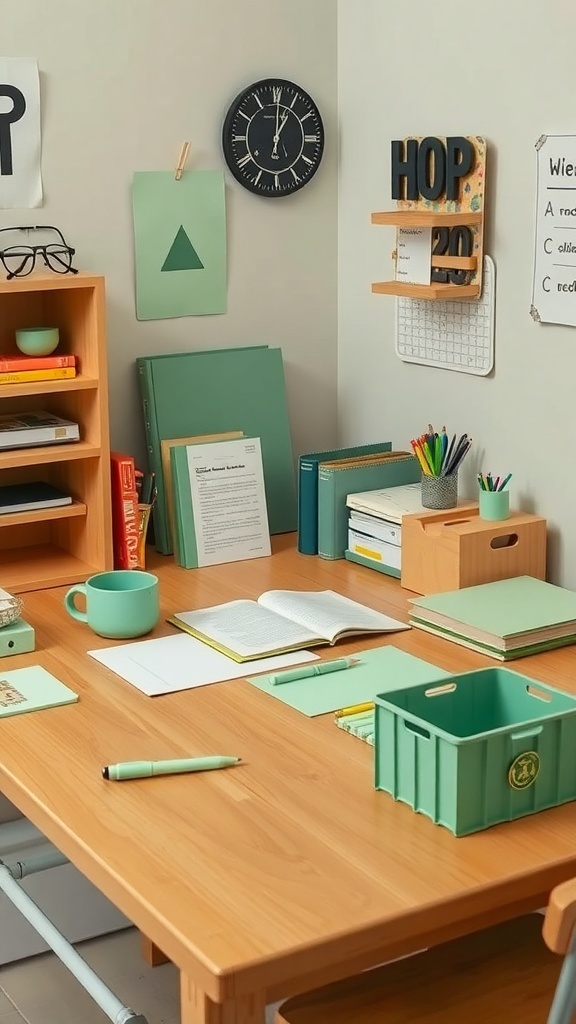 The desk features a wooden surface that adds warmth, complemented by sage green accessories. A stack of notebooks and folders in matching hues keeps everything tidy. The green mug and pen add a pop of color while remaining functional.