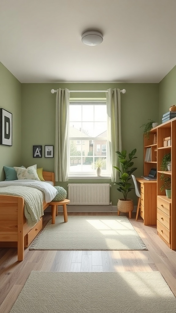 When designing a sage green dorm room, natural wood elements can bring warmth and a cozy feel. The image shows a lovely space where wood furniture complements the soft green walls. The wooden bed frame and desk add a touch of nature that balances the calming color scheme.