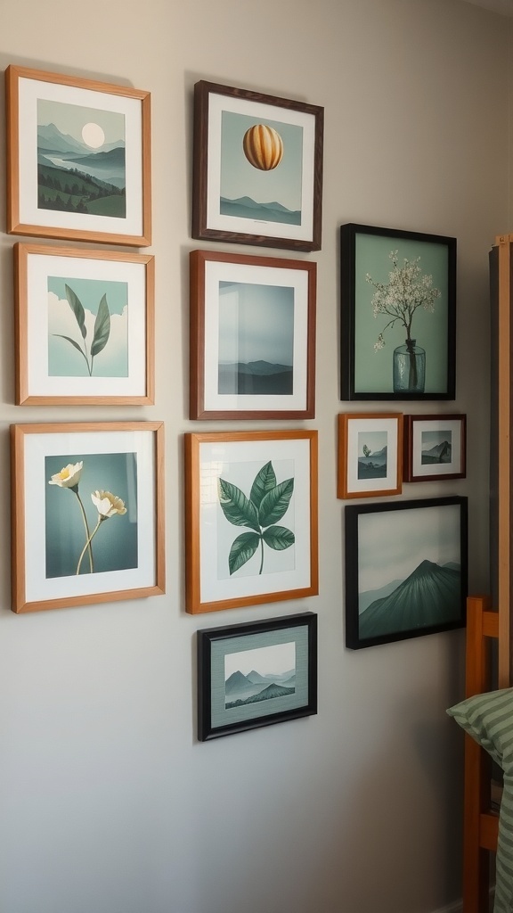 When it comes to decorating your dorm room, wall art can make a huge difference. Sage green is a calming color that brings a touch of nature indoors. The image showcases a beautiful arrangement of framed art pieces that highlight various shades of green and nature-inspired themes.