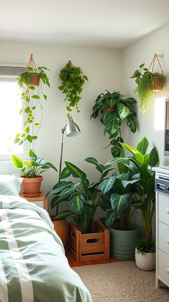 Hanging plants like pothos and ferns drape gracefully from the walls, creating a lovely vertical garden effect. These plants not only look great but also purify the air, making your room feel even more inviting. The larger plants, like the philodendron, bring a bold presence that balances the lighter tones of the bedding and walls.