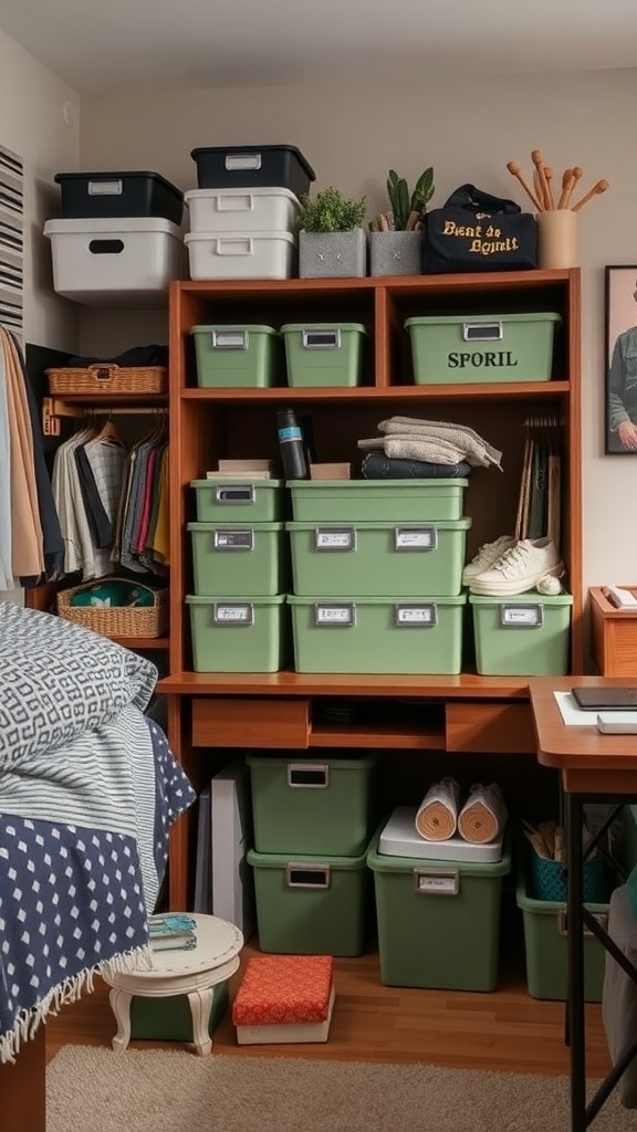 When it comes to creating a cozy dorm room, sage green storage solutions can make a big difference. The image showcases a well-organized space with various storage bins and shelves that blend style with functionality.