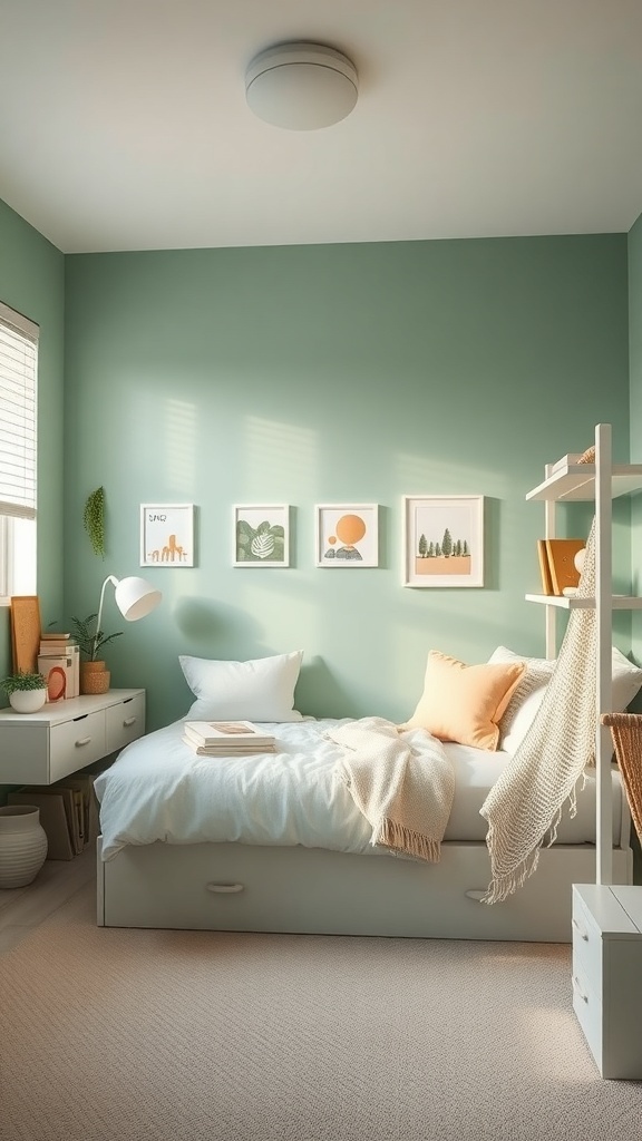 Consider adding a sage green desk or bookshelf to tie the room together. These pieces can help create a cohesive look while providing storage for your essentials. The soft hue of sage green can make the room feel larger and more inviting.