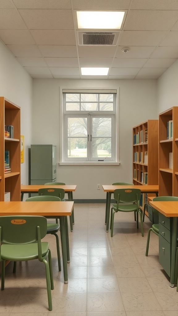 In the image, you can see sage green chairs paired with light wooden tables. This combination is not only stylish but also functional. The chairs offer comfort for long study sessions, while the tables provide ample space for books and laptops.