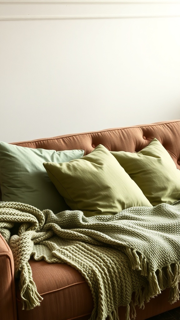 In the image, you can see a lovely arrangement of sage green pillows paired with a textured blanket. The combination of these elements creates a warm and welcoming atmosphere. The pillows are perfect for propping up while studying or lounging with friends.