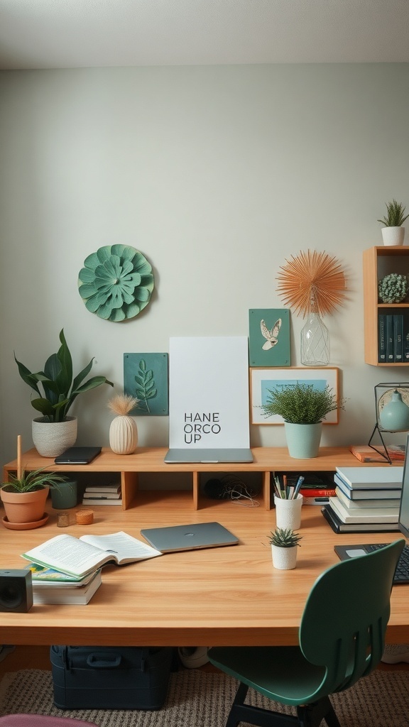 The desk is the focal point, with a laptop and books neatly arranged. Surrounding the workspace are various plants and decorative pieces in shades of green, which add life to the room. The wall art, including framed botanical prints, enhances the overall aesthetic while keeping the space personal and inviting.