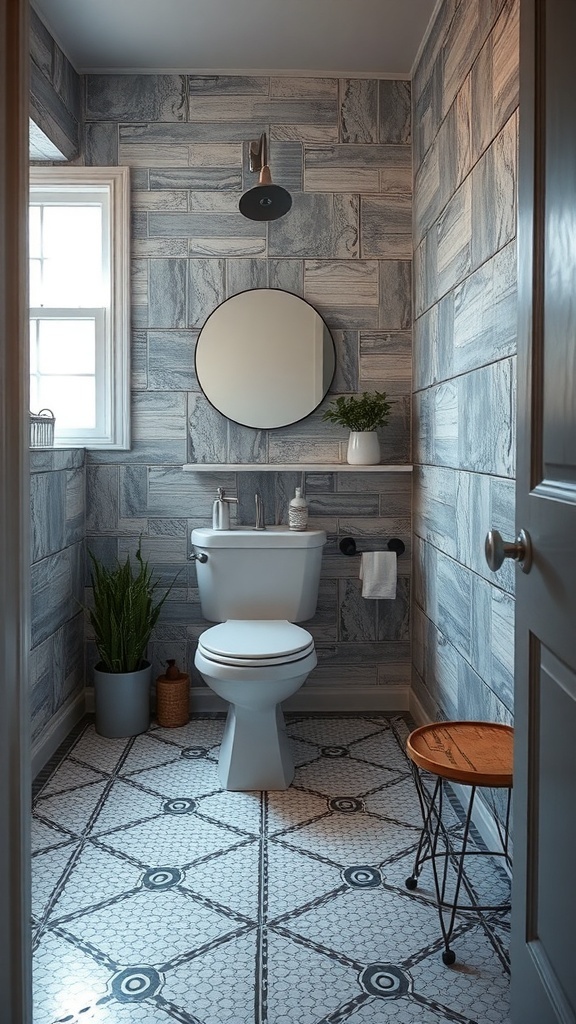 Choosing the right flooring can make a huge difference in a tiny downstairs toilet. The image showcases a stylish combination of wall and floor designs that work together beautifully. The gray, textured wall tiles create a modern feel, while the patterned floor tiles add a touch of charm.