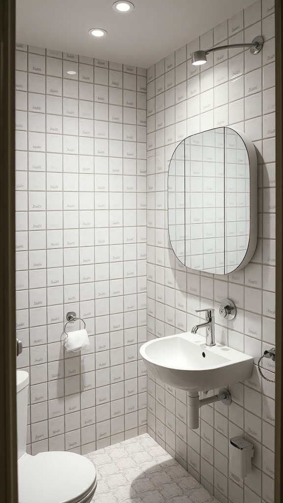 Wall tiles can completely change the look of a tiny downstairs toilet. The image shows a charming example of how patterned tiles can add character and style to a small space. The intricate design creates a visual interest that draws the eye, making the room feel more inviting.