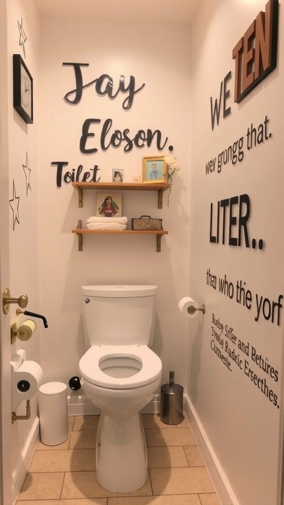 Wall art can completely change the vibe of a tiny downstairs toilet. In this image, the playful and quirky wall decorations bring personality to a small space. The large, bold lettering spells out fun phrases, making the room feel inviting and lighthearted.