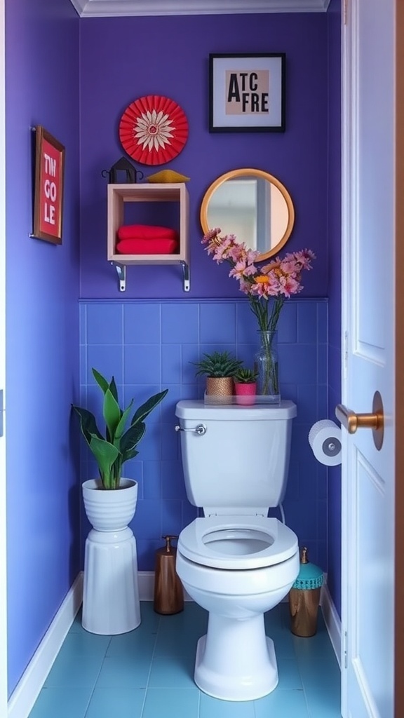 Small spaces can be a canvas for creativity. This tiny downstairs toilet showcases how bold accents can transform a compact area into something special. The vibrant purple walls immediately catch the eye, creating a lively atmosphere.