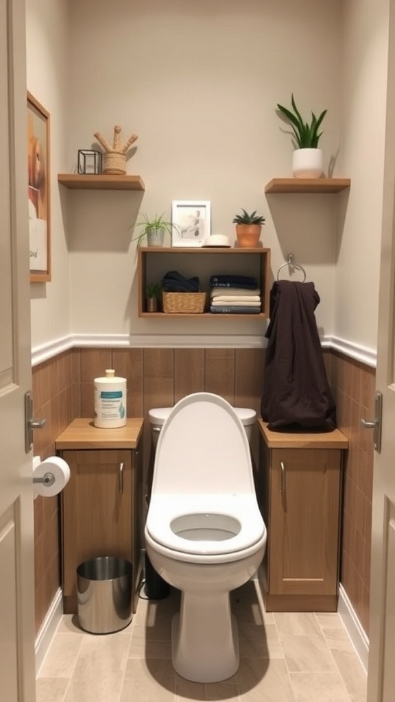 In a tiny downstairs toilet, every inch counts. This image showcases smart storage ideas that maximize space while keeping the area tidy. Notice the wooden cabinets flanking the toilet. They provide easy access to essentials without cluttering the floor.